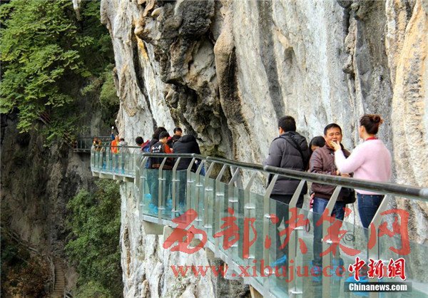3月24日,地處廣西融安縣石門仙湖景區(qū)的玻璃棧道試運(yùn)行,數(shù)十名游客體驗(yàn)“嘗鮮”。該玻璃棧道建在距離谷底達(dá)60米的懸崖壁上,下方是石門仙湖山石峻峭的中天坑,全長(zhǎng)309.4米、寬1.6米,是目前廣西最長(zhǎng)的玻璃棧道。