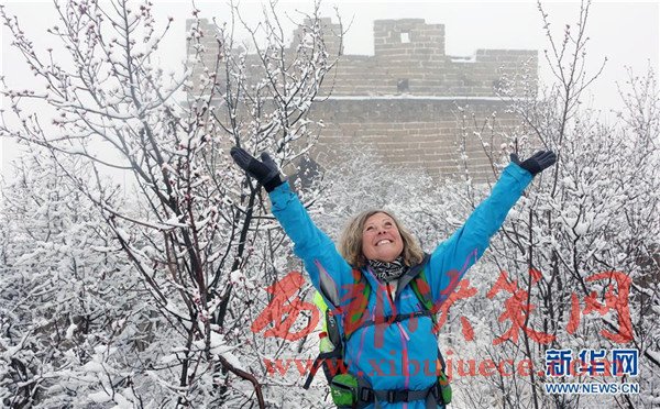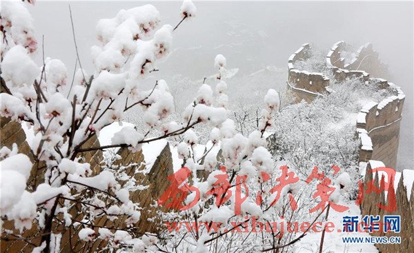 當(dāng)日,北京市懷柔區(qū)黃花城水長城迎來降雪,杏花、白雪與長城構(gòu)成了一幅幅美麗畫卷。