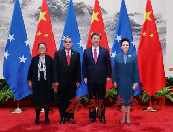 3月27日,國家主席習近平在北京人民大會堂同密克羅尼西亞聯(lián)邦總統(tǒng)克里斯琴舉行會談。會談前,習近平在人民大會堂東門外廣場為克里斯琴舉行歡迎儀式。這是習近平和夫人彭麗媛同克里斯琴總統(tǒng)夫婦合影。