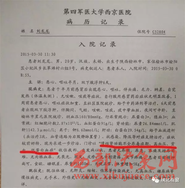 2015年3月我小兒子劉龍龍由感冒引發(fā)急性尿毒癥第五期,從此我們一家過上了人間少有的被恐懼包圍的日子。時(shí)至今日我們輾轉(zhuǎn)榆林星元醫(yī)院、西安西京醫(yī)院、西安交大附屬醫(yī)院等大醫(yī)院治療,前后做了8次血漿置換腹膜透析手術(shù)。每天透析3、4次,每一個(gè)月病人住院花費(fèi)四、五萬(wàn)元。2年時(shí)間花費(fèi)110多萬(wàn)元,現(xiàn)在就靠透析維持生命。因此醫(yī)生對(duì)我說(shuō),我兒子做透析不是長(zhǎng)久之計(jì),唯