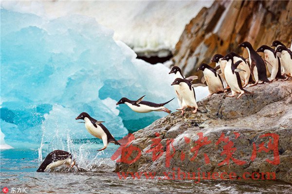 攝影師兼導游DaveMerron在南冰洋帶隊旅游時邂逅一群重返海洋的企鵝,這群可愛的小家伙排著隊站在巖石上,一個接一個跳進海洋“泡澡”,不遠處的冰山掩映著它們張開小短翅膀起飛的身影,畫面十分美好。