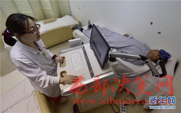 4月6日,一名抑郁癥患者(右)進行經(jīng)顱磁刺激物理治療。