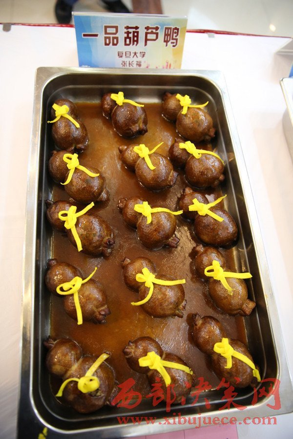 在長達(dá)數(shù)個小時(shí)的比賽中,來自37所上海高校的100多位廚師輪流上陣,共制作出菜品111個。圖為復(fù)旦大學(xué)一品葫蘆鴨。