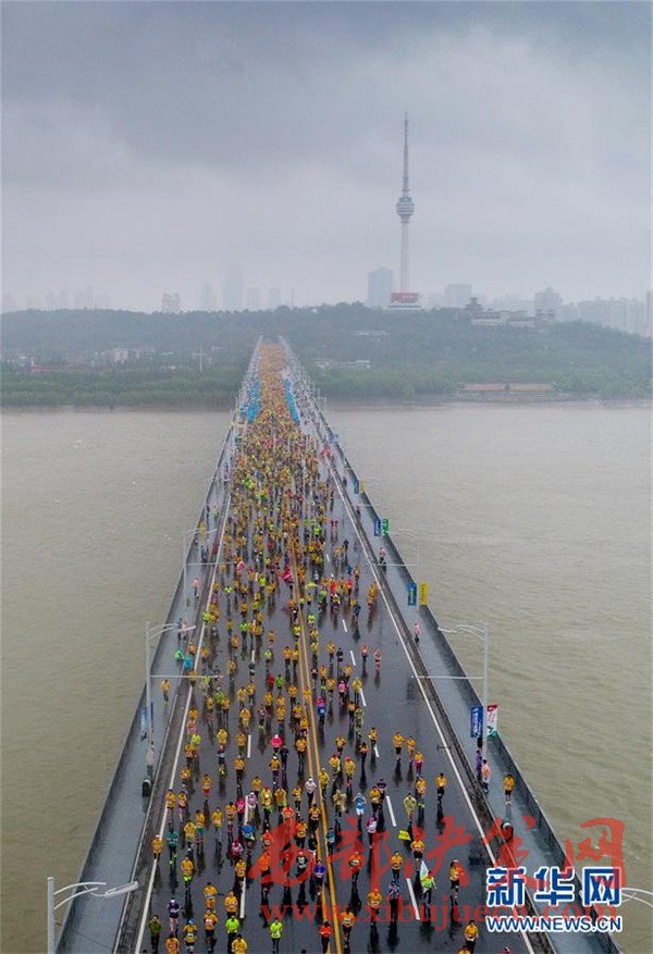 當日,2017武漢馬拉松在雨中鳴槍開跑。武漢馬拉松因穿越漢江、長江、東湖,橫跨包括武漢長江大橋在內(nèi)的多座橋梁而備受馬拉松愛好者追捧。