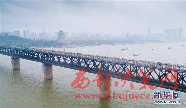 4月9日,馬拉松選手在武漢長江大橋上奔跑。
