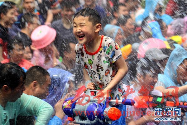 4月15日,一名小朋友在西雙版納景洪潑水廣場參加潑水狂歡。