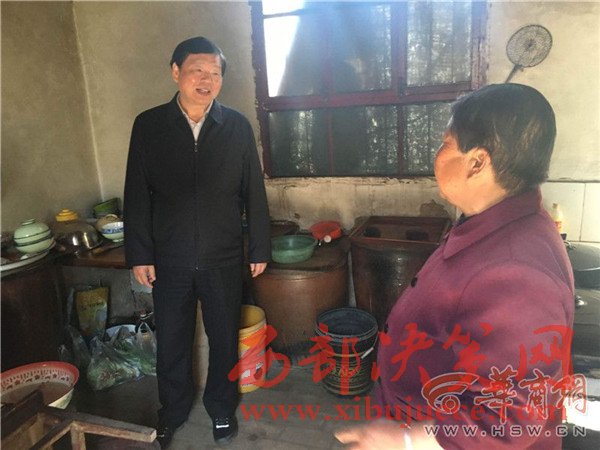 婁勤儉詳細(xì)了解了老人家庭成員、收入來源等,詢問了干部定點幫扶情況。隨后,他走進屋里察看生活情況,在土坑邊彎下腰了解如何取暖,在廚房詢問吃水等情況。走出廚房后,他感嘆,“條件確實不太好,我們的工作還得加把勁啊!”