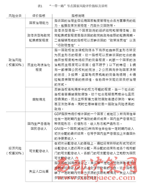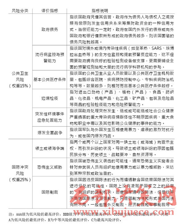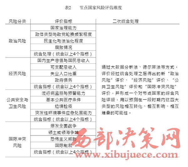 “一帶一路”建設(shè)中重要國家的治理風(fēng)險(xiǎn)是我們的主要關(guān)注對(duì)象,在借助國內(nèi)外智庫和科研院所已完成的眾多研究成果的基礎(chǔ)上,建立一套對(duì)節(jié)點(diǎn)國家風(fēng)險(xiǎn)的評(píng)級(jí)體系,如表1(見P28)所示。節(jié)點(diǎn)國家風(fēng)險(xiǎn)評(píng)價(jià)指標(biāo)中,政治風(fēng)險(xiǎn)與經(jīng)濟(jì)風(fēng)險(xiǎn)的評(píng)價(jià)參考經(jīng)濟(jì)學(xué)人智庫的國家風(fēng)險(xiǎn)模型(EIU country risk model);公共衛(wèi)生風(fēng)險(xiǎn)的評(píng)價(jià)參考中國衛(wèi)生與經(jīng)濟(jì)社會(huì)發(fā)展統(tǒng)計(jì)數(shù)據(jù)庫對(duì)公共衛(wèi)生的指標(biāo)設(shè)計(jì);國際沖突風(fēng)險(xiǎn)評(píng)價(jià)根據(jù)經(jīng)濟(jì)學(xué)人智庫發(fā)布的白皮書《愿景與挑戰(zhàn)——“一帶一路”沿線國家風(fēng)險(xiǎn)評(píng)估》與中國出口信用保險(xiǎn)公司發(fā)布的2015年版《國家風(fēng)險(xiǎn)分析報(bào)告》和《全球風(fēng)險(xiǎn)地圖》綜合考量得出。具體而言,我們可以從“政治風(fēng)險(xiǎn)”“經(jīng)濟(jì)風(fēng)險(xiǎn)”“公共衛(wèi)生風(fēng)險(xiǎn)”和“國際沖突風(fēng)險(xiǎn)”四個(gè)維度來評(píng)估選擇出的節(jié)點(diǎn)國家的風(fēng)險(xiǎn),如表2(見P30)所示。