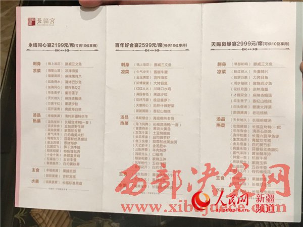 烏魯木齊市長(zhǎng)福宮天津路店的婚宴套餐菜單。