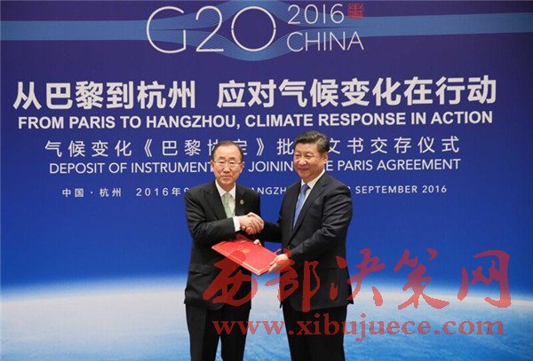 2016年9月3日,國(guó)家主席習(xí)近平同美國(guó)總統(tǒng)奧巴馬、聯(lián)合國(guó)秘書(shū)長(zhǎng)潘基文在杭州共同出席氣候變化《巴黎協(xié)定》批準(zhǔn)文書(shū)交存儀式。這是習(xí)近平向潘基文交存中國(guó)氣候變化《巴黎協(xié)定》批準(zhǔn)文書(shū)。(記者 蘭紅光 攝)