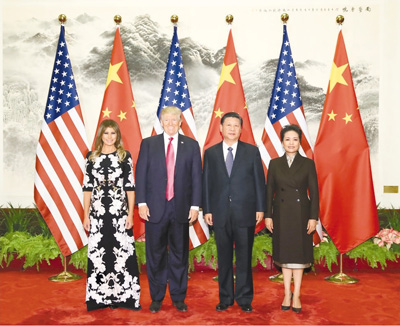 11月9日,國(guó)家主席習(xí)近平在北京人民大會(huì)堂東門(mén)外廣場(chǎng)舉行歡迎儀式,歡迎美利堅(jiān)合眾國(guó)總統(tǒng)唐納德·特朗普對(duì)中國(guó)進(jìn)行國(guó)事訪問(wèn)。這是習(xí)近平和夫人彭麗媛在人民大會(huì)堂同特朗普夫婦合影。(記者 蘭紅光 攝)