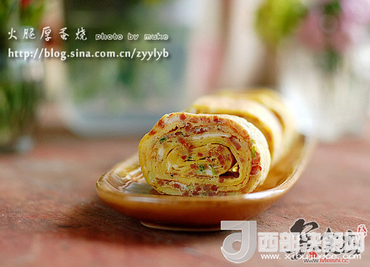 7.重復(fù)第6步驟,直到蛋液全部用完(每次倒蛋液的時候,都攪拌一下,不要讓火腿末等沉在碗底,鍋?zhàn)硬徽承Ч玫脑?,只需要開始時抹一次油即可,覺得粘的話,中途也可以抹油)。