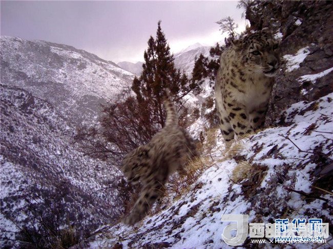 紅外相機在11月14日野外拍攝到的雪豹和其幼崽。新華社發(fā)