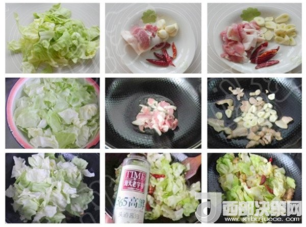 1、包菜撕小塊,用淡鹽水浸泡洗凈。