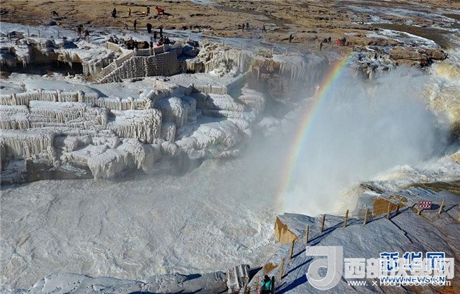 這是12月17日在山西吉縣黃河壺口瀑布拍攝的冰瀑彩虹景觀。當(dāng)日,黃河壺口瀑布出現(xiàn)彩虹景觀。壺口瀑布兩岸姿態(tài)萬千的冰瀑,與瀑布上空的彩虹相映成趣,美不勝收。(呂桂明 攝)