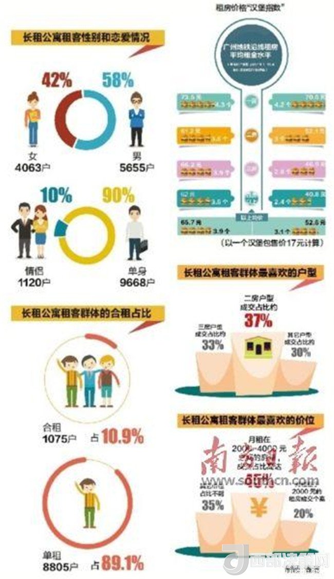那么,對廣州這座全國主要的一線城市來說,目前的住房租賃市場和租房的情況與其他城市有何不同呢?最近,南方日報(bào)、南方+聯(lián)合萬科泊寓、廣州中原地產(chǎn)等企業(yè)機(jī)構(gòu),在“租房時(shí)代”南方號(hào)向廣大網(wǎng)友和住房租賃行業(yè)人士推出了“廣州地鐵沿線住房平均租金漢堡指數(shù)”、“長租公寓租房群體畫像”等系列大數(shù)據(jù)分析產(chǎn)品。