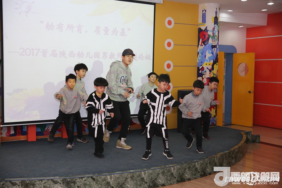 論壇上,西安市浐灞第二幼兒園的謝曉鳴和孩子們帶來(lái)的街舞表演點(diǎn)燃了全場(chǎng),讓大家感受到幼兒園男教師的熱情和激情;陜西師范大學(xué)幼兒園的韓凱帶來(lái)的鋼琴演奏《一壺美酒》傳達(dá)了深切的情感,讓人回味無(wú)窮;西航天鼎保育院的趙棟用挺拔健美的身姿表演的拉丁串燒,展現(xiàn)了生命自信的力量;電信十所幼兒園的孫博一只單簧管演奏,吹出了男教師細(xì)致柔情的一面;西安市雁塔區(qū)第一幼兒園的陳曉峰演唱的《祖國(guó),慈祥的母親》讓我們領(lǐng)略了幼兒園男教師專(zhuān)業(yè)的唱功和對(duì)職業(yè)的自信;西北工業(yè)大學(xué)幼兒園教師董樂(lè)帶領(lǐng)小朋友展示了動(dòng)感的啦啦操和籃球活動(dòng),場(chǎng)上的小運(yùn)動(dòng)員自信的運(yùn)球、上籃、投球,矯健的身姿,專(zhuān)注的表情,默契的配合,感染著在場(chǎng)的每一位教師;西安市第五保育院肖波和陜西睿星體育一群陽(yáng)光帥氣的男教師組織的趣味體能游戲?qū)⒒顒?dòng)氣氛推向了高潮。