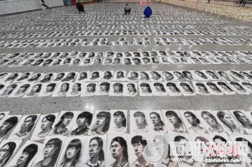 資料圖:一次模擬考試中,老師穿行在15000張肖像畫中,為畫作打分。(記者 韋亮 攝)