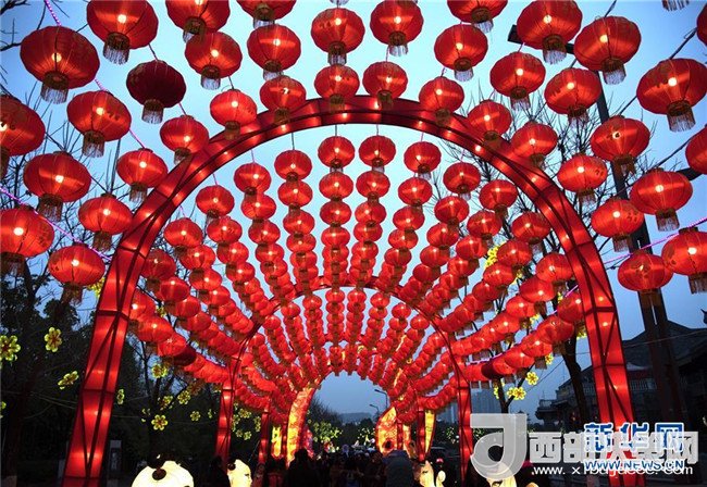 1月1日,在武漢園博園第三屆花燈會上,市民在大紅燈籠組成的長廊中穿行。當日,武漢園博園第三屆花燈會開幕。本屆花燈會共設置8大版塊118組彩燈,吸引了許多市民前來觀賞。(記者 程敏 攝)
