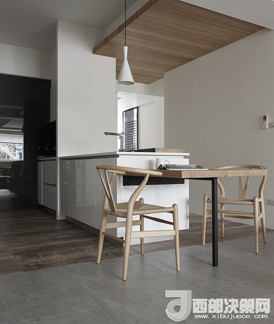 將洗手臺(tái)放在中間的位置,配上組合的簡(jiǎn)易餐桌,不做吧臺(tái)的設(shè)計(jì)也能滿(mǎn)足開(kāi)放式的需求,在家下廚較少的業(yè)主可以考慮。