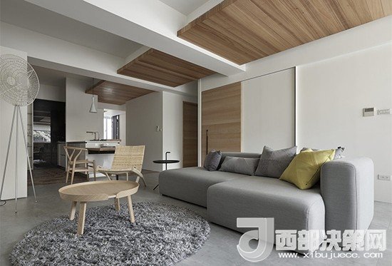 原木和灰色的主線(xiàn)搭配中加入了一只淡黃色抱枕點(diǎn)綴,既不破壞整體的恬淡舒適,又能使空間顯得更加有活力。