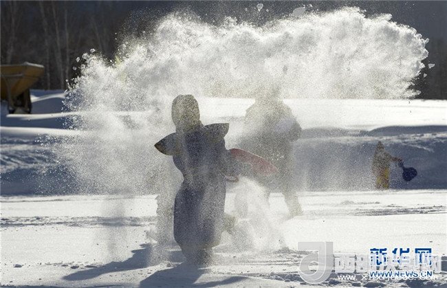 白雪潑出“熱”新年 游客在禾木村潑雪(1月1日攝)。(記者 趙戈 攝)