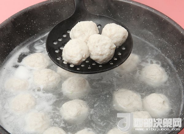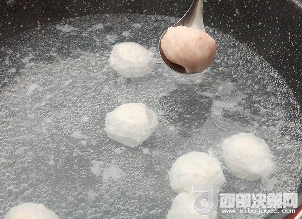 5、裝著魚丸的勺子在冷水鍋里輕輕抖一下,魚丸就自行脫落了。