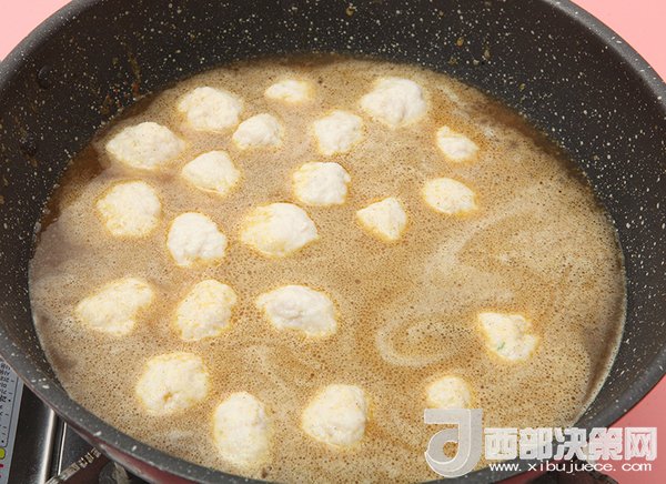 8、鍋中放入油,蒜末,洋蔥末爆香,加入魚蛋小炒一會(huì)兒。再放入水沒過魚丸,放入咖喱塊。