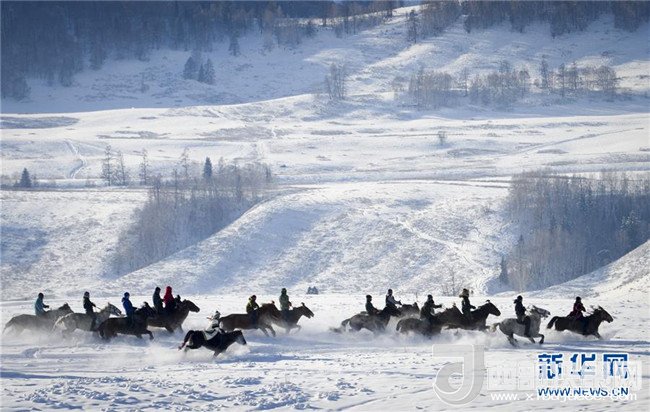 在新疆喀納斯禾木村舉辦的潑雪節(jié)上,當(dāng)?shù)鼐用裨跒橛慰捅硌萏?月1日攝)。記者 趙戈 攝