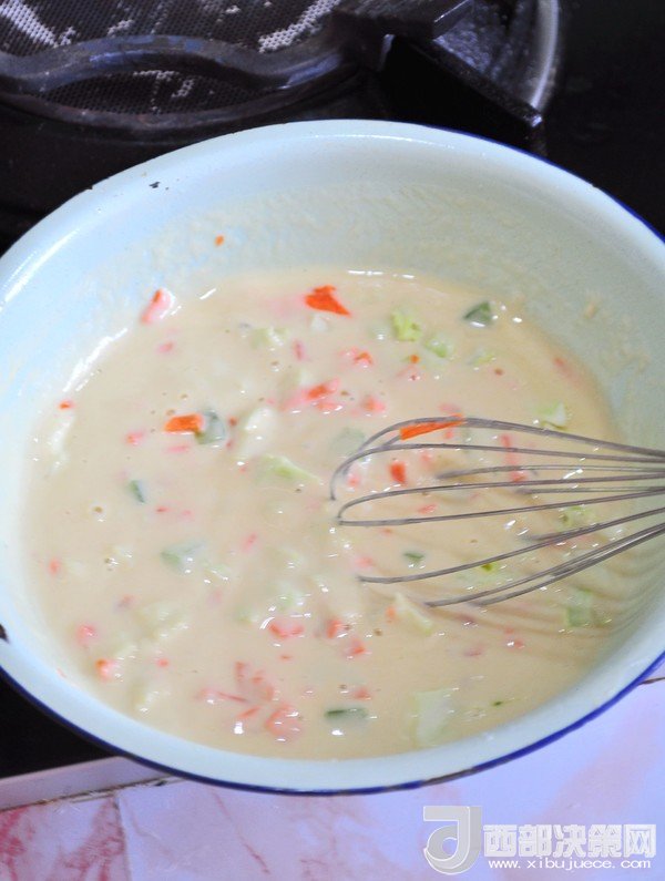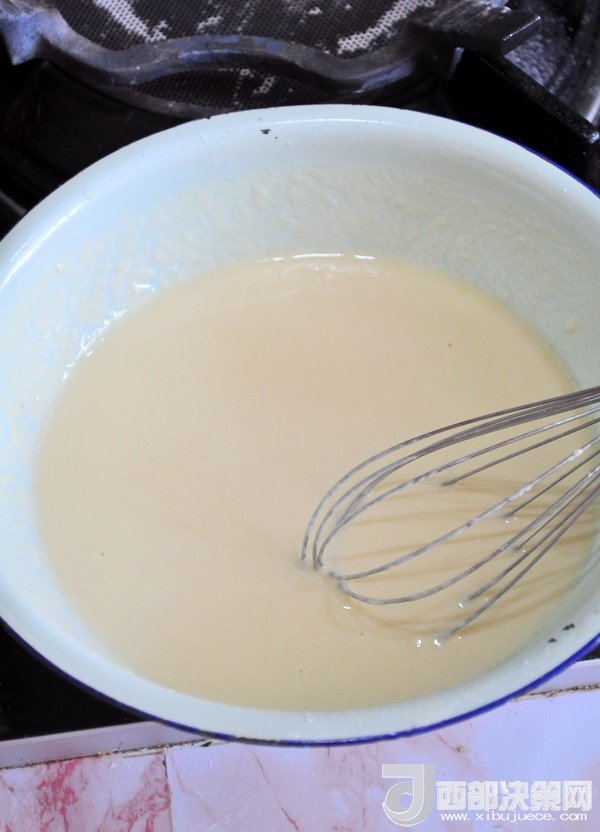 4.調(diào)成均勻的面糊,不要太稀,如酸奶般的稠度。如果口味重可以加點(diǎn)鹽。