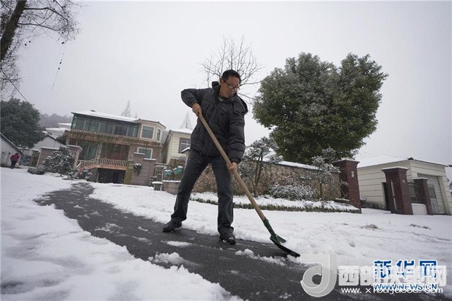 1月25日,一位村民在浙江省湖州市安吉縣清理道路積雪。