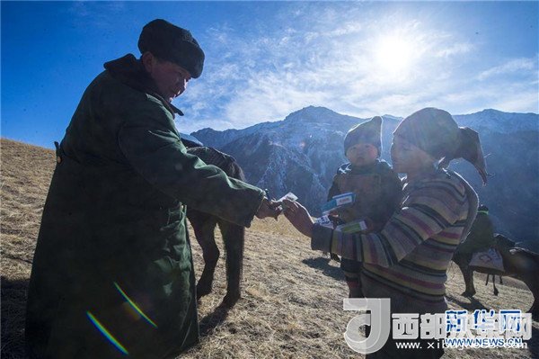 巡診隊(duì)醫(yī)生賽山在為牧民送藥(2017年12月17日攝)。
