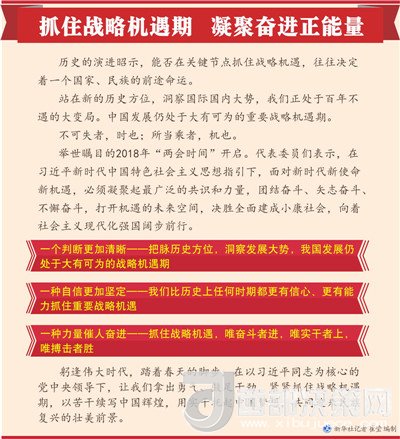 舉世矚目的2018年“兩會時間”開啟。代表委員們表示,在習近平新時代中國特色社會主義思想指引下,面對新時代新使命新機遇,必須凝聚起最廣泛的共識和力量,團結奮斗、矢志奮斗、不懈奮斗,打開機遇的未來空間,決勝全面建成小康社會,向著社會主義現(xiàn)代化強國闊步前行。