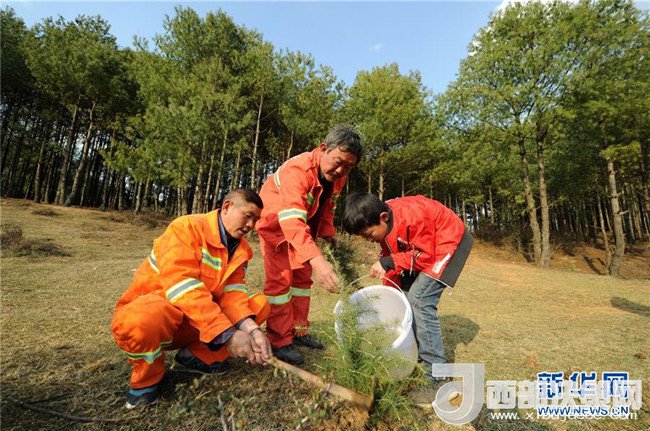 3月10日,沙子坡林場(chǎng)的護(hù)林員與他們的孩子在林區(qū)補(bǔ)植樹苗。