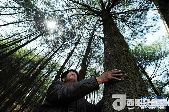 3月10日,沙子坡林場(chǎng)的老護(hù)林員王明才在看他33年前親手種下的華山松。