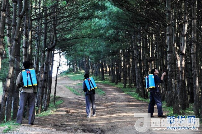 沙子坡林場(chǎng)的護(hù)林員在林區(qū)內(nèi)噴灑藥劑防治病蟲害(2013年7月8日攝)。