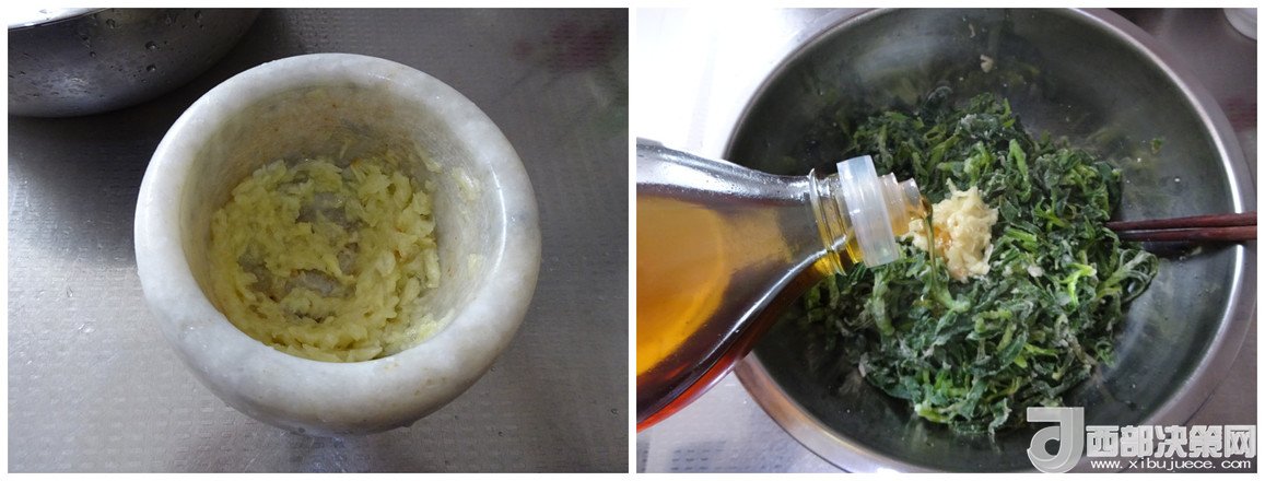 5.大蒜放一丟丟鹽搗成蒜泥,放入盆中,倒入適量的香油,拌勻即可,每到這個(gè)時(shí)候我就會(huì)開始流口水了,香油和蒜泥混合后的香氣,太誘人了 記住,吃蒸菜必須放蒜泥,不然味道減一半哦