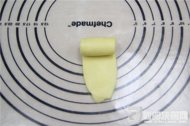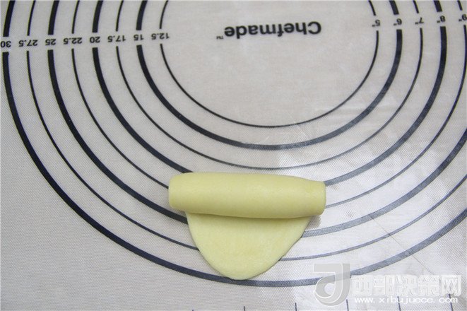 18.油酥面團(tuán)直立放著,然后用搟面杖搟成長(zhǎng)條橢圓。