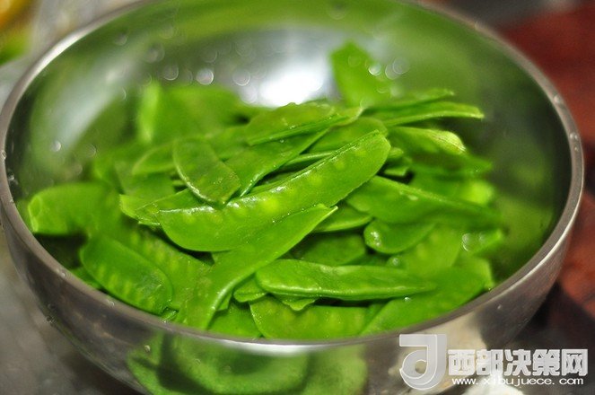 5.水燒開,加點(diǎn)油和鹽,把荷蘭豆下入焯燙斷生。撈出過涼。這樣更綠。