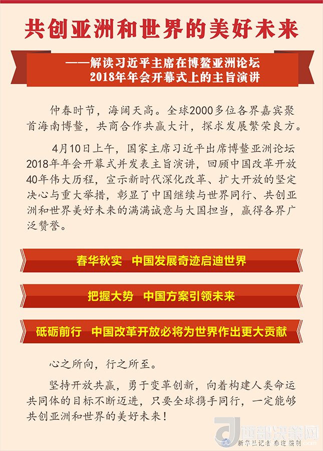 4月10日上午,國(guó)家主席習(xí)近平出席博鰲亞洲論壇2018年年會(huì)開(kāi)幕式并發(fā)表主旨演講,回顧中國(guó)改革開(kāi)放40年偉大歷程,宣示新時(shí)代深化改革、擴(kuò)大開(kāi)放的堅(jiān)定決心與重大舉措,彰顯了中國(guó)繼續(xù)與世界同行、共創(chuàng)亞洲和世界美好未來(lái)的滿滿誠(chéng)意與大國(guó)擔(dān)當(dāng),贏得各界廣泛贊譽(yù)。