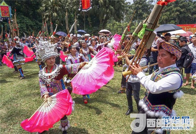 4月18日,在廣西柳州市龍?zhí)豆珗@,人們進(jìn)行蘆笙踩堂慶祝“三月三”。新華社發(fā)(賴柳生 攝)