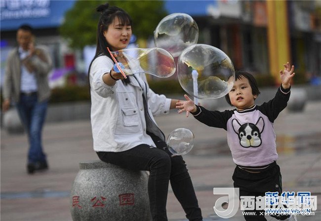 4月25日,3歲的宋雅萱和姐姐一起在人民公園廣場玩耍。新華社記者陶明攝