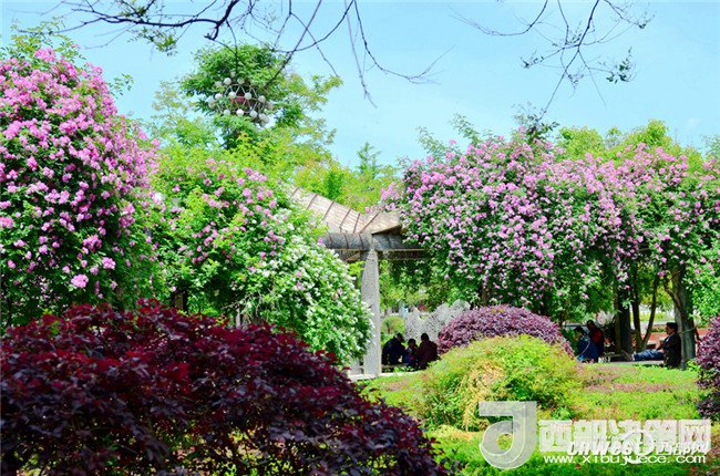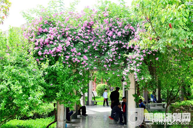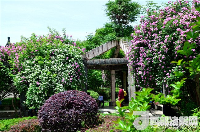 5月1日,市民正在寧強(qiáng)縣縣城三角洲公園里的薔薇花下納涼賞花。