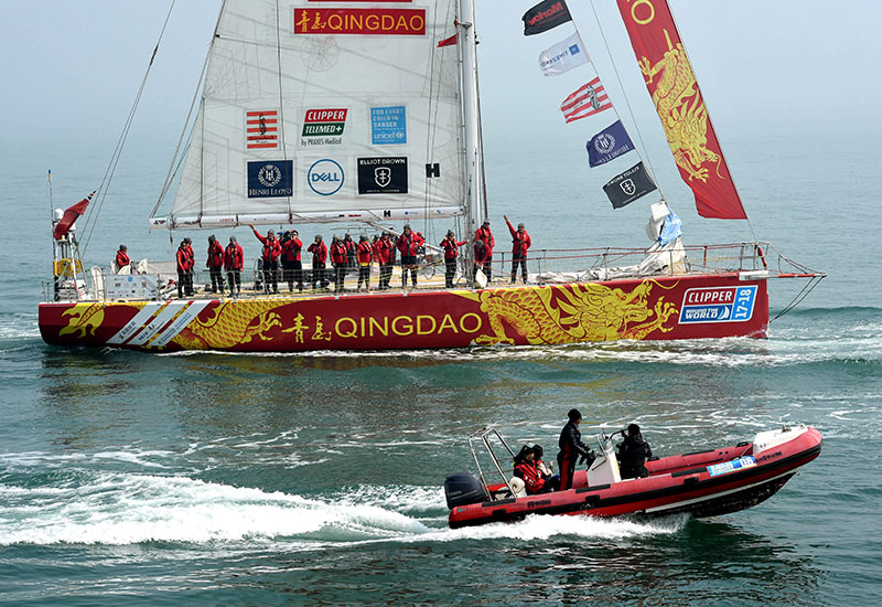 在青島西海岸新區(qū)星光島碼頭,參加2017-2018克利伯環(huán)球帆船賽的青島號船員與送行的觀眾揮手道別(3月23日攝)。新華社記者 李紫恒 攝
