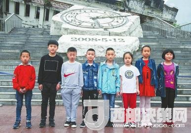 2018年5月1日,8個孩子站在汶川縣映秀鎮(zhèn)漩口中學遺址前,拍下了一張合影。