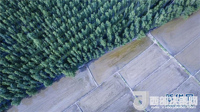 在新疆察布查爾錫伯自治縣扎庫齊牛錄鄉(xiāng)拍攝的一處防護林旁的水稻田(5月21日無人機拍攝)。近日,隨著氣溫漸高,地處新疆伊犁河谷的察布查爾錫伯自治縣迎來插秧高峰期,田間地頭一派繁忙景象。塊塊稻田水滿如鏡,田間防護林枝繁葉茂,遠處雪山依稀可見,如一幅在大地上鋪展開的生態(tài)畫卷。新華社記者胡虎虎攝
