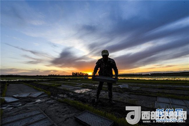 夕陽西下,村民在新疆察布查爾錫伯自治縣種羊場托海依村的一處農(nóng)田里勞動(5月21日攝)。近日,隨著氣溫漸高,地處新疆伊犁河谷的察布查爾錫伯自治縣迎來插秧高峰期,田間地頭一派繁忙景象。塊塊稻田水滿如鏡,田間防護林枝繁葉茂,遠處雪山依稀可見,如一幅在大地上鋪展開的生態(tài)畫卷。新華社記者胡虎虎攝