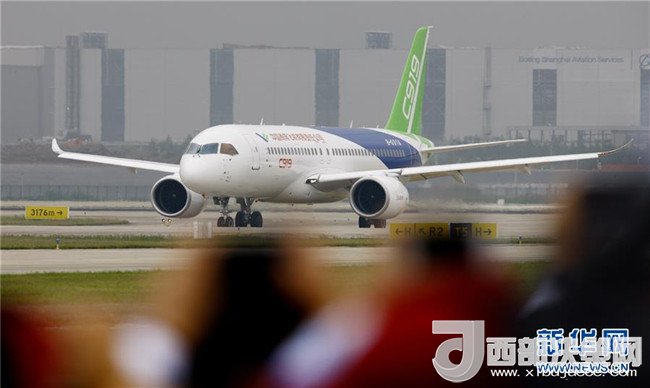 中國(guó)首款國(guó)際主流水準(zhǔn)的干線(xiàn)客機(jī)C919在上海浦東國(guó)際機(jī)場(chǎng)首飛成功(2017年5月5日攝)。新華社記者方喆攝
