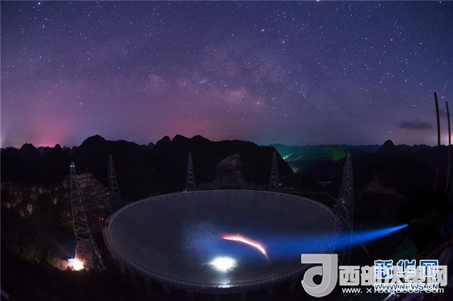 FAST在滿(mǎn)天繁星下呈現(xiàn)出的美麗景觀(2016年6月27日攝)。2017年10月10日,中國(guó)科學(xué)院國(guó)家天文臺(tái)宣布,被譽(yù)為“中國(guó)天眼”的500米口徑球面射電望遠(yuǎn)鏡(FAST)經(jīng)過(guò)一年緊張調(diào)試,已實(shí)現(xiàn)指向、跟蹤、漂移掃描等多種觀測(cè)模式的順利運(yùn)行,并確認(rèn)了多顆新發(fā)現(xiàn)脈沖星。新華社記者劉續(xù)攝