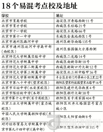 北京教育考試院公布了18個容易混淆名稱或走錯校區(qū)的考點名單,共涉及4類。第一類是考點的名稱相似、只有一字之差的考點,比如北京市育才學校與北京市育英學校,北京市十一學校與北京市第十一中學,北京市通州區(qū)潞河中學與北京市通州區(qū)運河中學。